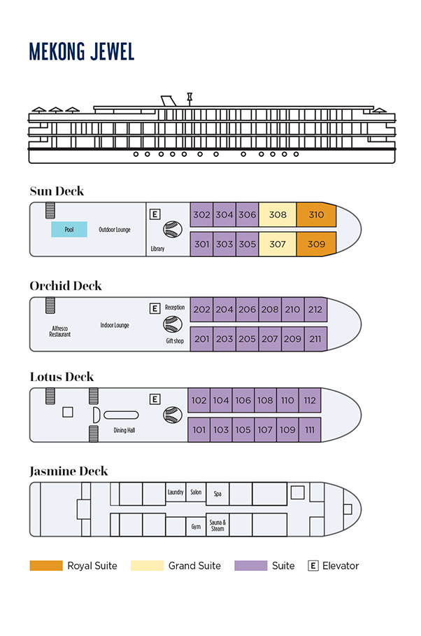 Estreando em 3 de janeiro de 2020, o Mekong Jewel será o navio mais novo e mais luxuoso do rio Mekong. Este Super Navio de suíte incluirá dois locais para refeições: um restaurante principal e um restaurante ao ar livre no andar superior. O Mekong Jewel substituirá o Mekong Navigator e está sendo construído com materiais sustentáveis ​​e ecológicos, e contará com piscina, spa, sauna e sauna a vapor, academia, salão de cabeleireiro, manicure, dois salões e uma biblioteca.