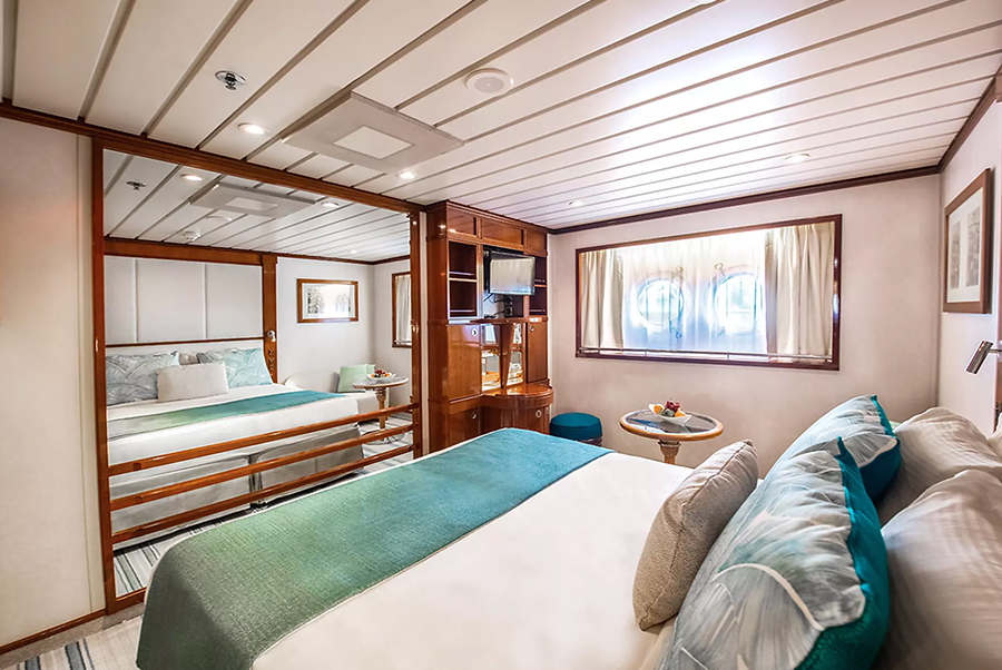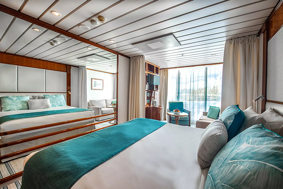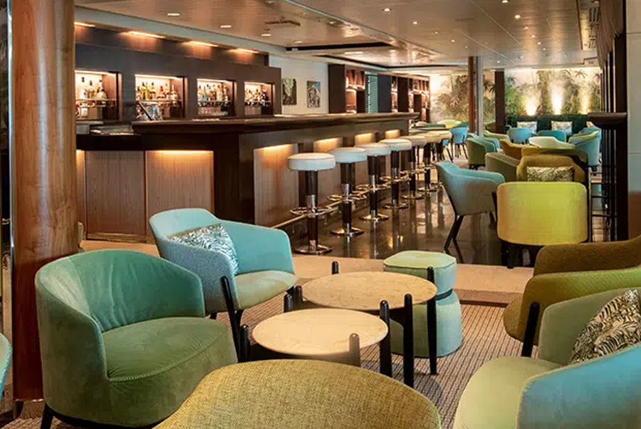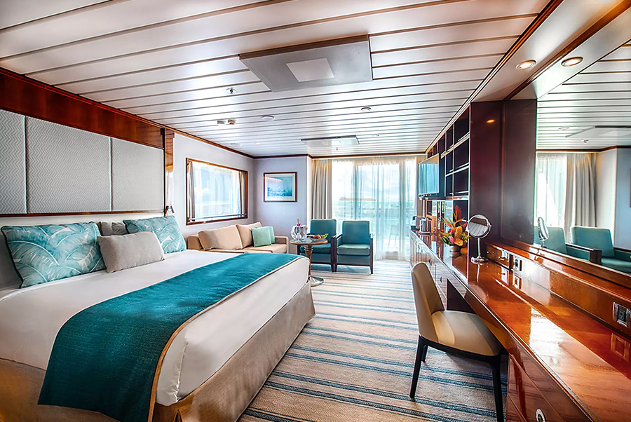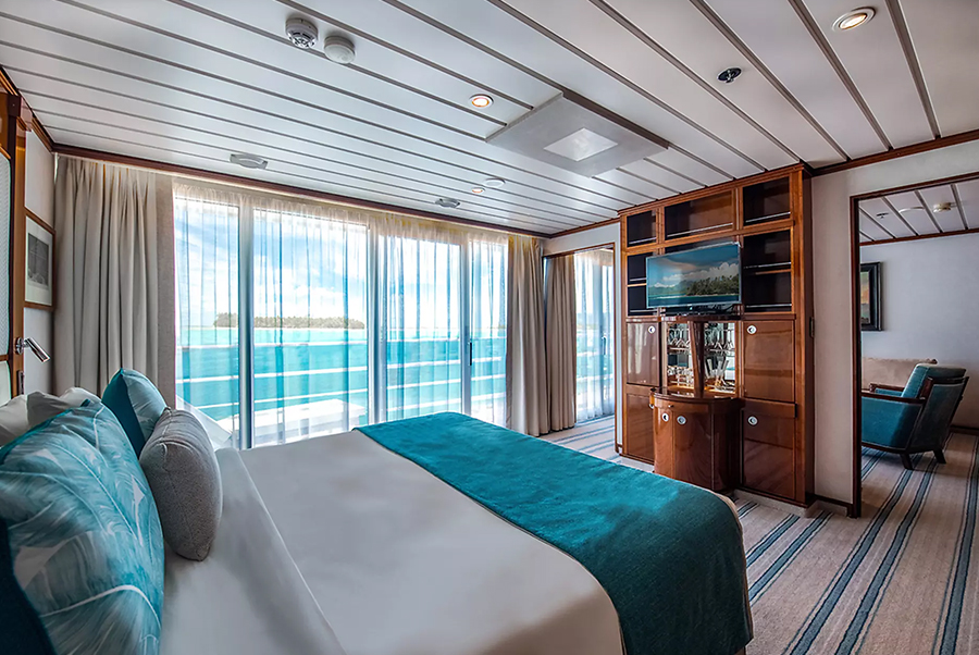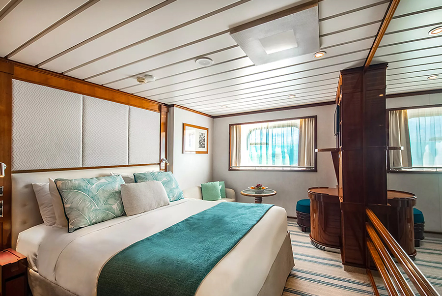 Suas 165 cabines e suítes têm vista externa e são decoradas com bom gosto. Materiais de qualidade como madeiras preciosas, gravuras antigas e detalhes em tiki homenageiam a cultura polinésia e contribuem para o encanto da vida a bordo, tornando cada viagem única.