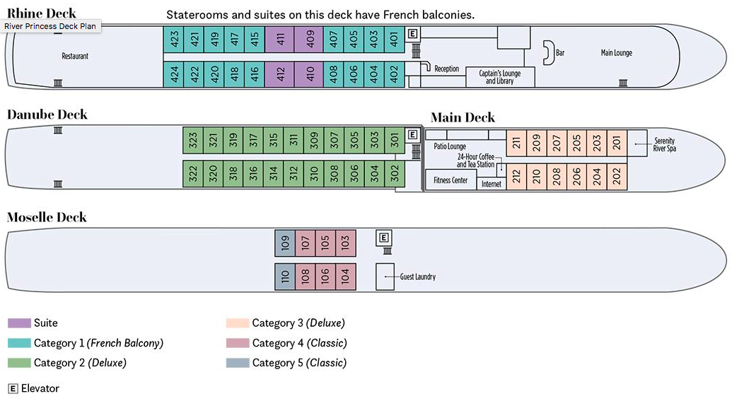 O impressionante hall de entrada do River Princess, com 128 passageiros, define um tom indulgente e luxuoso para sua viagem pela Europa. Em todo o navio, verdes em tons de joia, marrons quentes e uma mistura de preto e branco criam um ambiente sofisticado, enquanto áreas públicas elegantes – incluindo um Lounge principal, um Sky Lounge e um Lounge e biblioteca do capitão – oferecem lugares confortáveis ​​para se aconchegar um bom livro, conversar com amigos ou tome seu coquetel favorito.
