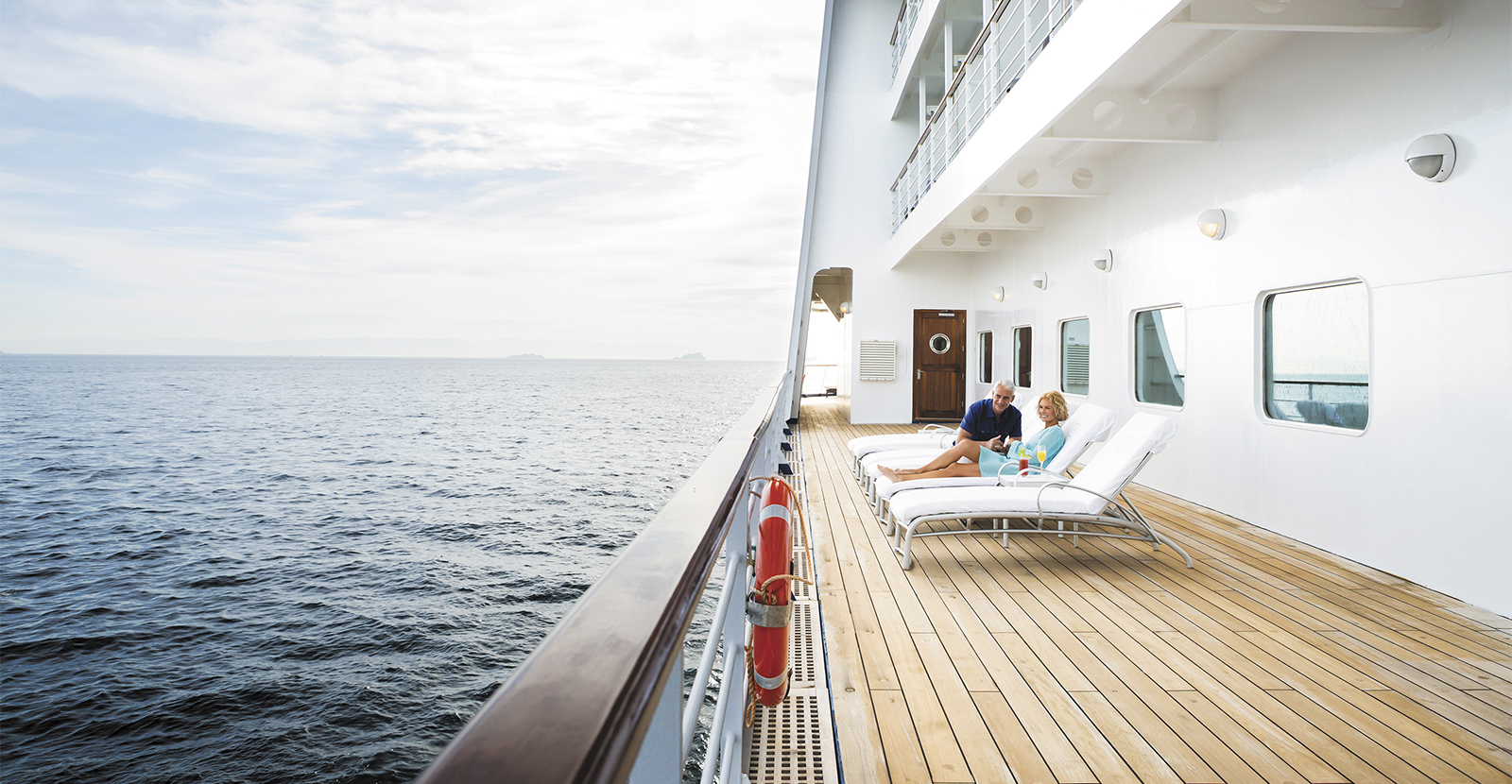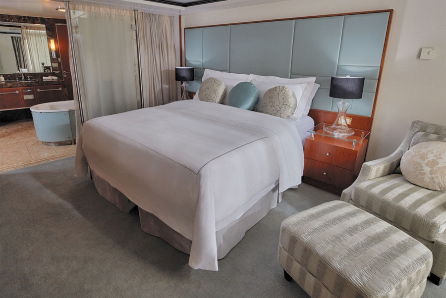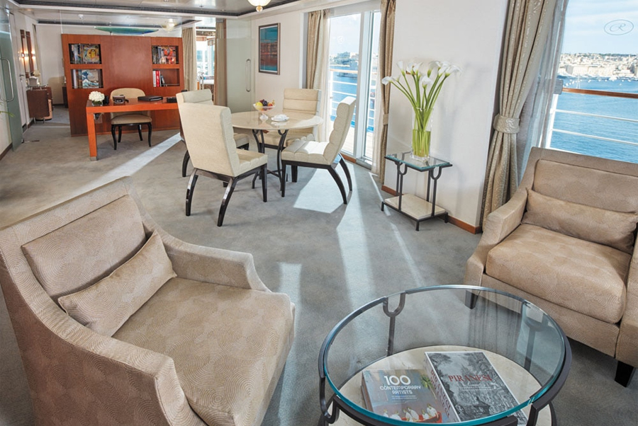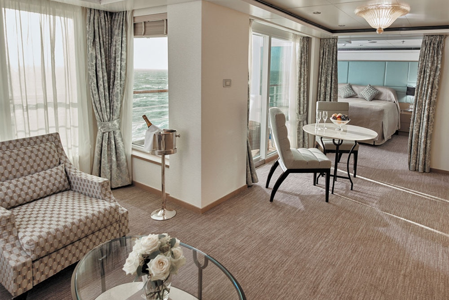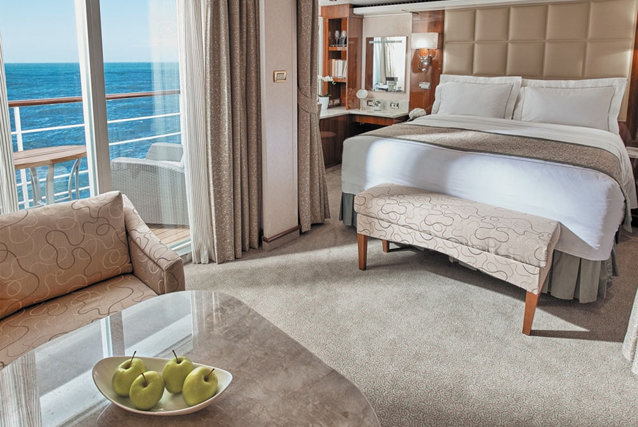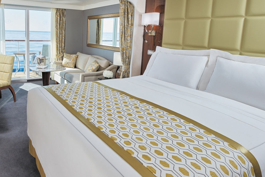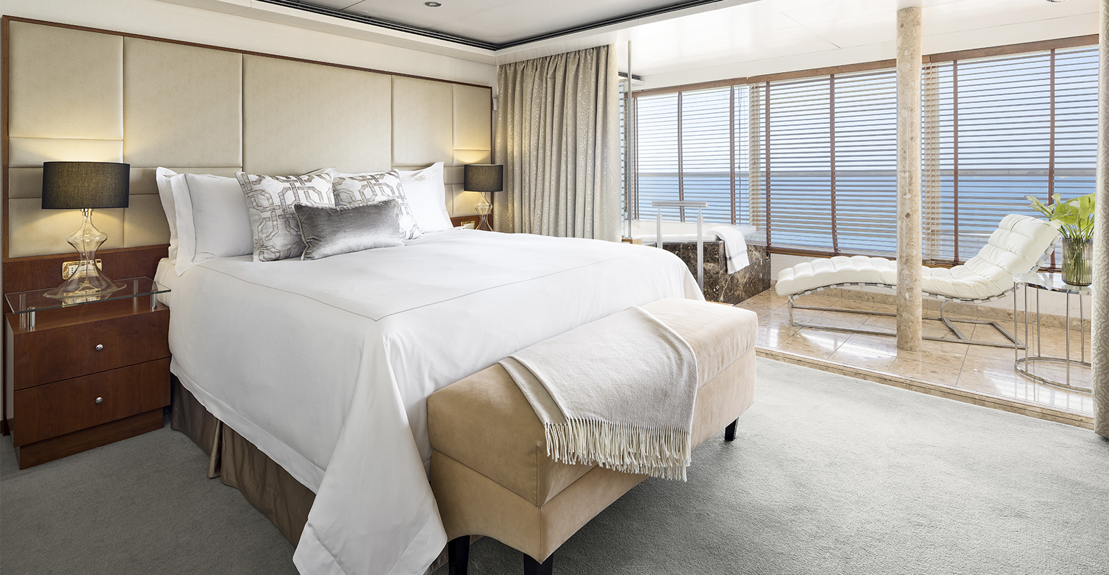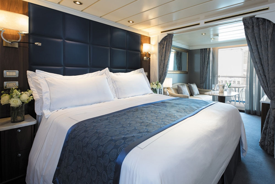Cada suíte do Seven Seas Voyager® tem uma varanda privativa, além de detalhes de mármore no banheiro e armários espaçosos. Beba uma xícara de café ou uma taça de vinho e faça refeições ao ar livre com o serviço de quarto enquanto aprecia as vistas intermináveis e a brisa fresca do mar.
