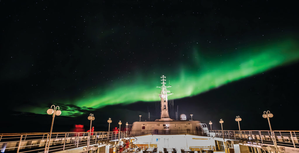 Outra opção para observar o fenômeno é o itinerário da Noruega a Islândia (a partir de US$ 20.800 por pessoa). São 15 dias a bordo do Silver Explorer, cruzeiro de luxo projetado especificamente para navegar em alguns dos destinos mais remotos do mundo. A viagem inicia na cidade de Tromso, considerada a Paris do Norte pelos noruegueses. Ainda no país, os hóspedes vivenciam uma magnífica experiência com a natureza, conhecendo Ilha do Urso, arquipélago que preserva diversas espécies de pássaros,  a costa oeste de Spitsbergen, que oferece vistas fascinantes de formações geológicas, montanhas escarpadas, geleiras espetaculares e uma variedade de aves marinhas e focas.